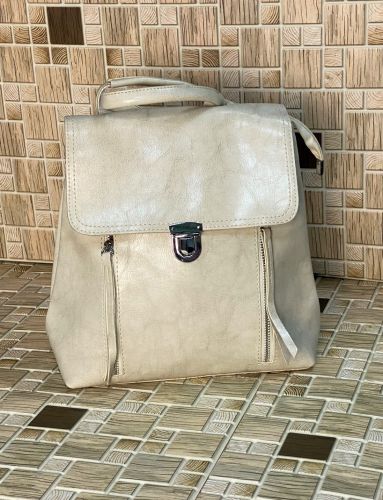 Женский рюкзак трансформер из экокожи . Закрывается клапаном и на молнию. Снаружи, на передней стенке вертикальный кармашек на молнии, на задней стенке горизонтальный карман на молнии. Внутри одно отделение и боковой кармашек. Лямки рюкзака вытягиваются в длинные ручки, что позволяет носить его через плечо как сумку. Снаружи, в верхней части, по бокам есть кнопки, которые позволяют сделать рюкзак Размеры: длина: 22см, ширина: 10см, высота 25см.